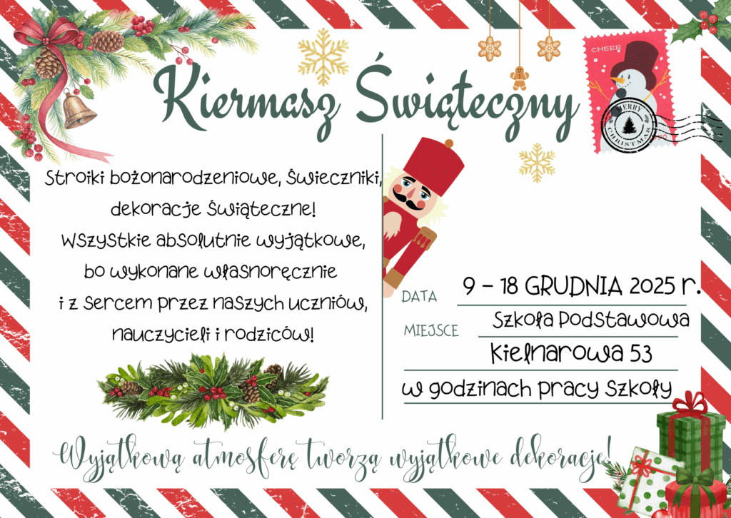 Szkoła Podstawowa w Kielnarowej zaprasza wszystkich Uczniów do udziału w Międzyszkolnym Konkursie „Tradycyjna Kartka Bożonarodzeniowa”. Szczegóły w Regulaminie zawartym w zakładce „Konkursy”.