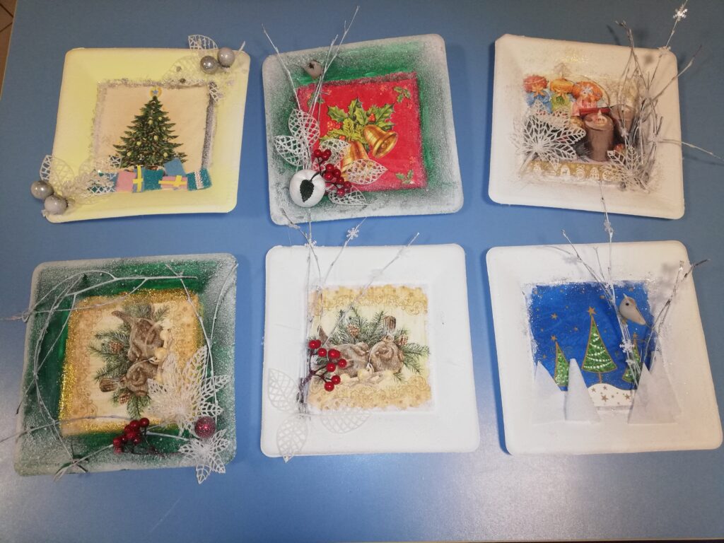 Podczas zajęć koła plastycznego w listopadzie zajęliśmy się projektowaniem i wykonywaniem dekoracyjnych obrazków zimowych. Kompozycje te, w świątecznym klimacie tworzone były częściowo w technice decoupage. Uczniowie mieli możliwość wzbogacać, według własnej inwencji te kompozycje, a więc dekorowali i układali dodatkowe elementy z wielką radością. Najważniejszy jednak przyświecał nam cel – zrobione obrazki zostały przeznaczone na kiermasz dobroczynny, który odbył się w grudniu w naszej szkole zorganizowany przez panie pedagog na rzecz chorej dziewczynki.