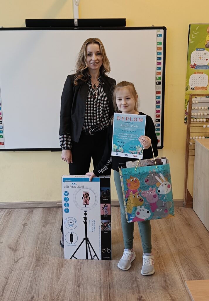 Alicja W. z kl. III po wręczeniu nagrody wraz z nauczycielką plastyki