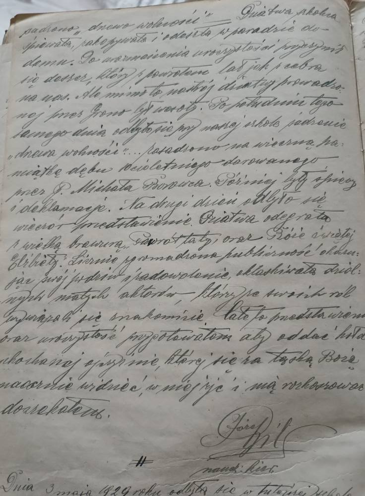Następnego dnia odbyło się przedstawienie. Brawurowo wykonano „Powrót taty” i „Róże św. Elżbiety” Jak napisał autor zapisków „Całe to przedstawienie oraz uroczystość przygotowałem aby oddać hołd ukochanej Ojczyźnie, której się za łaską Bożą naocznie widzieć, w niej żyć i nią rozkoszować doczekałem”.