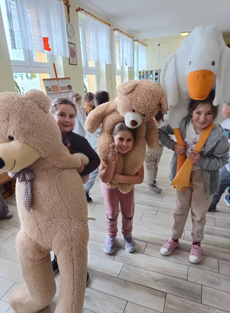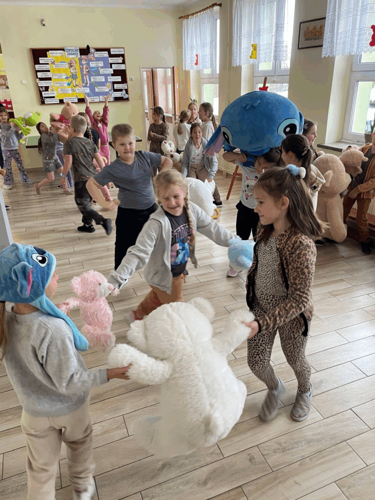 Nie zabrakło też dobrej zabawy – uczniowie wzięli udział w misiowej przerwie tanecznej🐻🥳! Można było pląsać z ukochanym Pluszakiem 🥰.