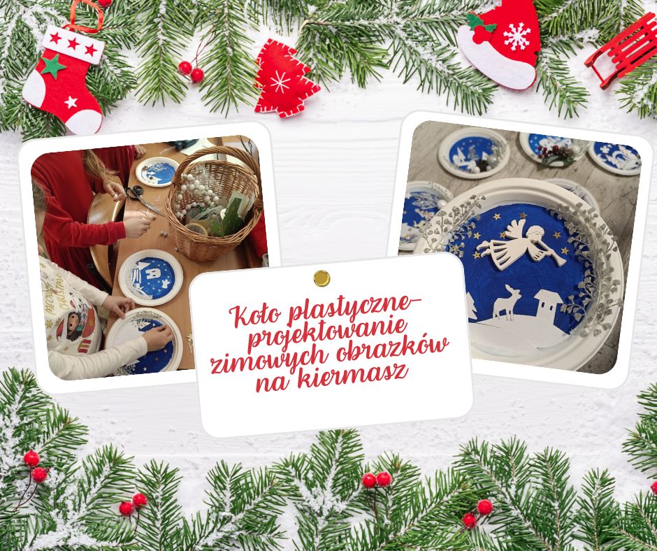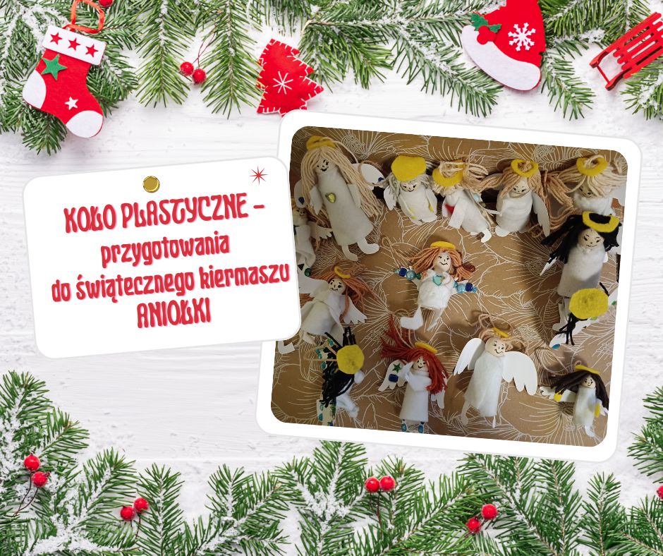 Przygotowania do świątecznego kiermaszu w szkole ruszyły już w październiku. Cotygodniowe spotkania koła plastycznego, to był bardzo pracowity czas. Każdy z uczestników starał się jak najstaranniej wykonać swoje prace. Urocze aniołki wydają się podobne, ale jednak każdy ma szyk nadany mu przez młodego autora. Pełne atmosfery świątecznej są obrazki projektowane w kształcie koła. Każdy jest inny i jedyny w swoim rodzaju. Gratulujemy młodym twórcom!