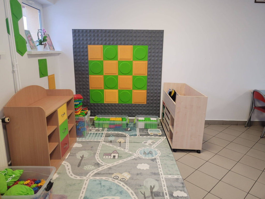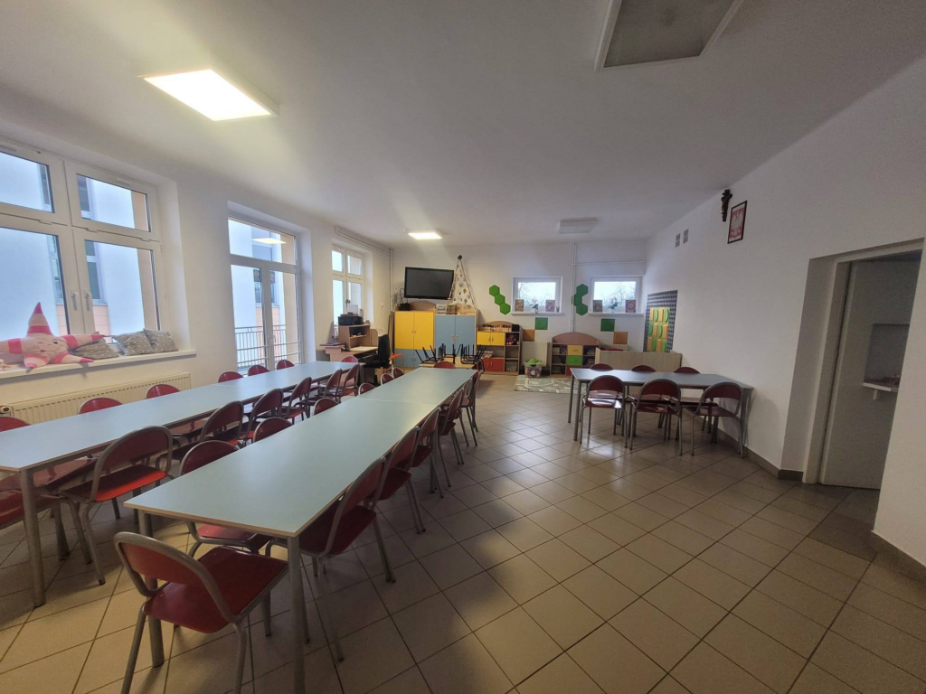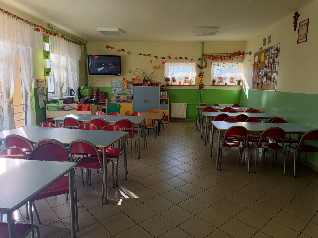 . Wydzielona została strefa do zabawy i strefa stołówki.