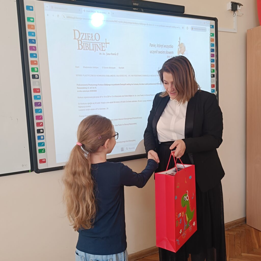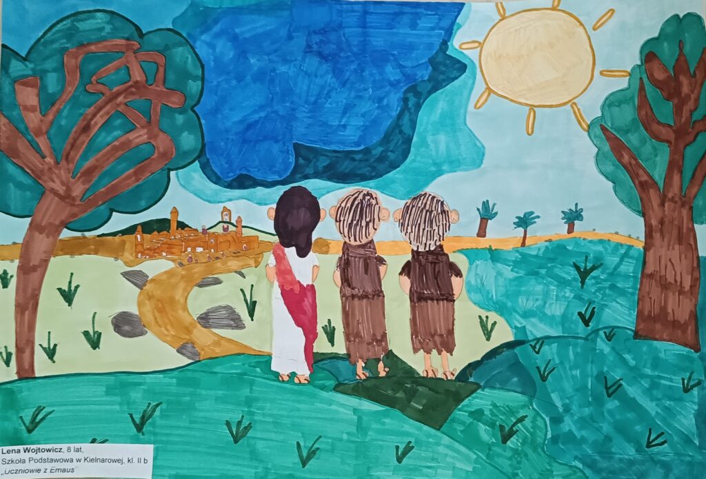 Diecezja Rzeszowska wraz ze Szkołą Podstawową Nr 16 w Rzeszowie organizują cyklicznie Plastyczny Konkurs Biblijny. W tym roku również kilkoro uczniów z naszej szkoły podjęło się tworzenia ilustracji do tekstu z Nowego Testamentu. Pracowali nad pomysłami podczas zajęć koła plastycznego. W wyniku regulaminowych eliminacji do etapu diecezjalnego przeszło po trzy prace z kategorii klas I-II oraz trzy z klas III-IV, które reprezentowały SP w Kielnarowej. Lena Wojtowicz z kl. II b otrzymała wyróżnienie w tym konkursie. Cieszymy się bardzo z tego sukcesu – gratulujemy! Praca Leny przedstawia wędrówkę uczniów wraz Jezusem do Emaus. Jej kompozycja skupia uwagę na postaciach w centrum. Dobrze dobrane kolory i dokładne wykonanie. Pani Dyrektor wręczyła Lenie przekazaną nagrodę w imieniu organizatorów konkursu. Gratuluję również pozostałym uczniom, którzy także wspaniale wykonali ilustracje do innych fragmentów Ewangelii.